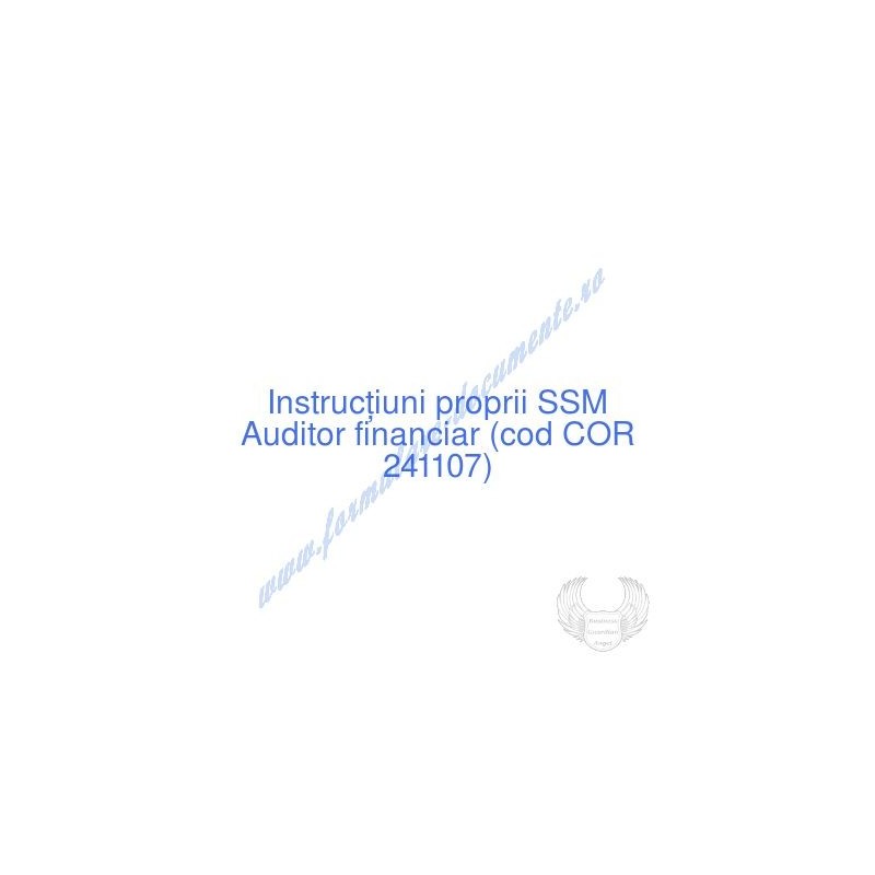 Aceste documente OBLIGATORII pentru ocupantul postului de Auditor financiar (cod COR 241107), sunt complet întocmite, respectând cerințele Codului muncii actualizat 2023, Legii securității și sănătății în muncă nr. 319/2006 (actualizată 2023), H.G. 1425/2006 (actualizată 2023) și răspund tuturor cerințelor standardelor de calitate referitoare la management (ISO 9001/ ISO 14001/ ISO 22000/ SR OHSAS 18001:2008/ ISO 45001:2018 etc.). Cuprinsul IPSSM pentru instruirea angajatului pe funcția de Auditor financiar :