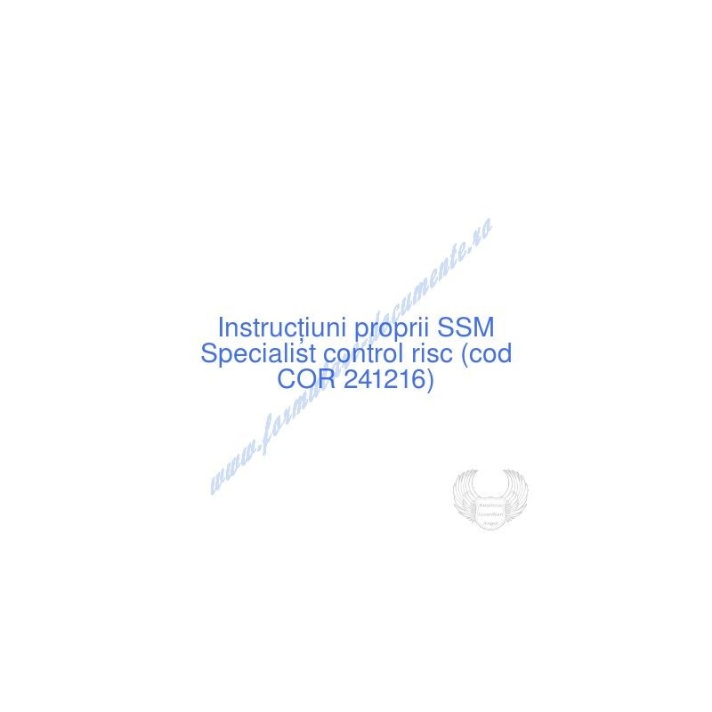 Aceste documente OBLIGATORII pentru ocupantul postului de Specialist control risc (cod COR 241216), sunt complet întocmite, respectând cerințele Codului muncii actualizat 2023, Legii securității și sănătății în muncă nr. 319/2006 (actualizată 2023), H.G. 1425/2006 (actualizată 2023) și răspund tuturor cerințelor standardelor de calitate referitoare la management (ISO 9001/ ISO 14001/ ISO 22000/ SR OHSAS 18001:2008/ ISO 45001:2018 etc.). Cuprinsul IPSSM pentru instruirea angajatului pe funcția de Specialist control risc :