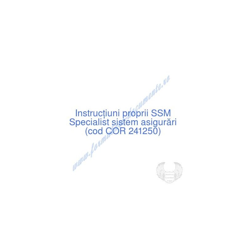 Aceste documente OBLIGATORII pentru ocupantul postului de Specialist sistem asigurări (cod COR 241250), sunt complet întocmite, respectând cerințele Codului muncii actualizat 2023, Legii securității și sănătății în muncă nr. 319/2006 (actualizată 2023), H.G. 1425/2006 (actualizată 2023) și răspund tuturor cerințelor standardelor de calitate referitoare la management (ISO 9001/ ISO 14001/ ISO 22000/ SR OHSAS 18001:2008/ ISO 45001:2018 etc.). Cuprinsul IPSSM pentru instruirea angajatului pe funcția de Specialist sistem asigurări :