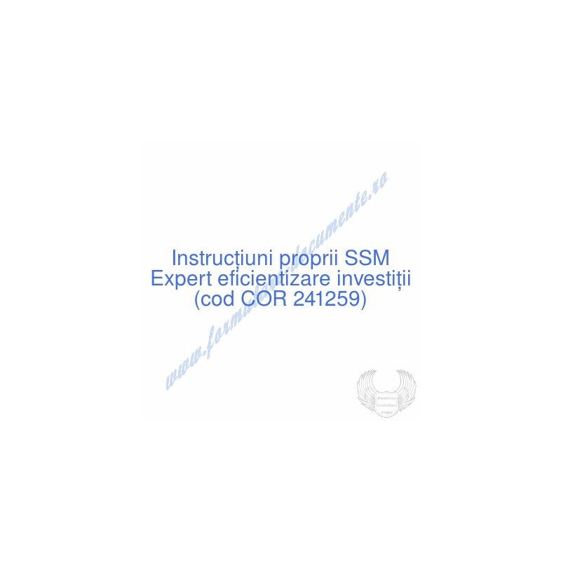 Aceste documente OBLIGATORII pentru ocupantul postului de Expert eficientizare investiţii (cod COR 241259), sunt complet întocmite, respectând cerințele Codului muncii actualizat 2023, Legii securității și sănătății în muncă nr. 319/2006 (actualizată 2023), H.G. 1425/2006 (actualizată 2023) și răspund tuturor cerințelor standardelor de calitate referitoare la management (ISO 9001/ ISO 14001/ ISO 22000/ SR OHSAS 18001:2008/ ISO 45001:2018 etc.). Cuprinsul IPSSM pentru instruirea angajatului pe funcția de Expert eficientizare investiţii :