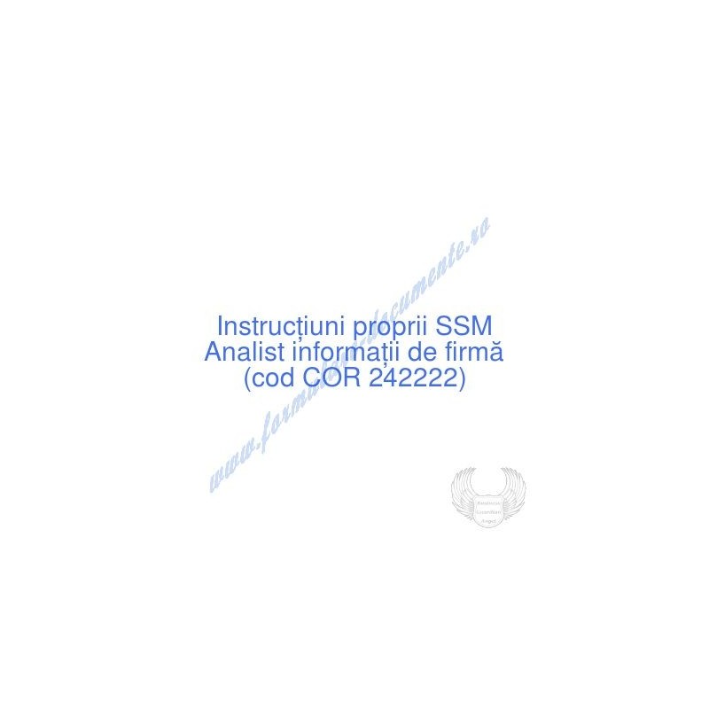 Aceste documente OBLIGATORII pentru ocupantul postului de Analist informaţii de firmă (cod COR 242222), sunt complet întocmite, respectând cerințele Codului muncii actualizat 2023, Legii securității și sănătății în muncă nr. 319/2006 (actualizată 2023), H.G. 1425/2006 (actualizată 2023) și răspund tuturor cerințelor standardelor de calitate referitoare la management (ISO 9001/ ISO 14001/ ISO 22000/ SR OHSAS 18001:2008/ ISO 45001:2018 etc.). Cuprinsul IPSSM pentru instruirea angajatului pe funcția de Analist informaţii de firmă :