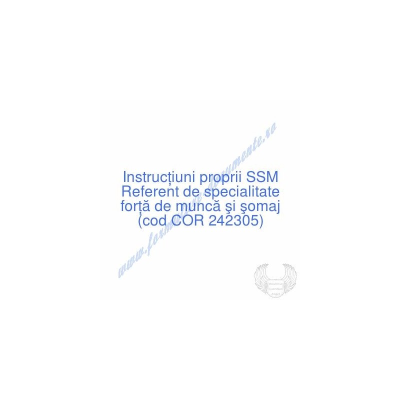 Aceste documente OBLIGATORII pentru ocupantul postului de Referent de specialitate forţă de muncă şi şomaj (cod COR 242305), sunt complet întocmite, respectând cerințele Codului muncii actualizat 2023, Legii securității și sănătății în muncă nr. 319/2006 (actualizată 2023), H.G. 1425/2006 (actualizată 2023) și răspund tuturor cerințelor standardelor de calitate referitoare la management (ISO 9001/ ISO 14001/ ISO 22000/ SR OHSAS 18001:2008/ ISO 45001:2018 etc.). Cuprinsul IPSSM pentru instruirea angajatului pe funcția de Referent de specialitate forţă de muncă şi şomaj :