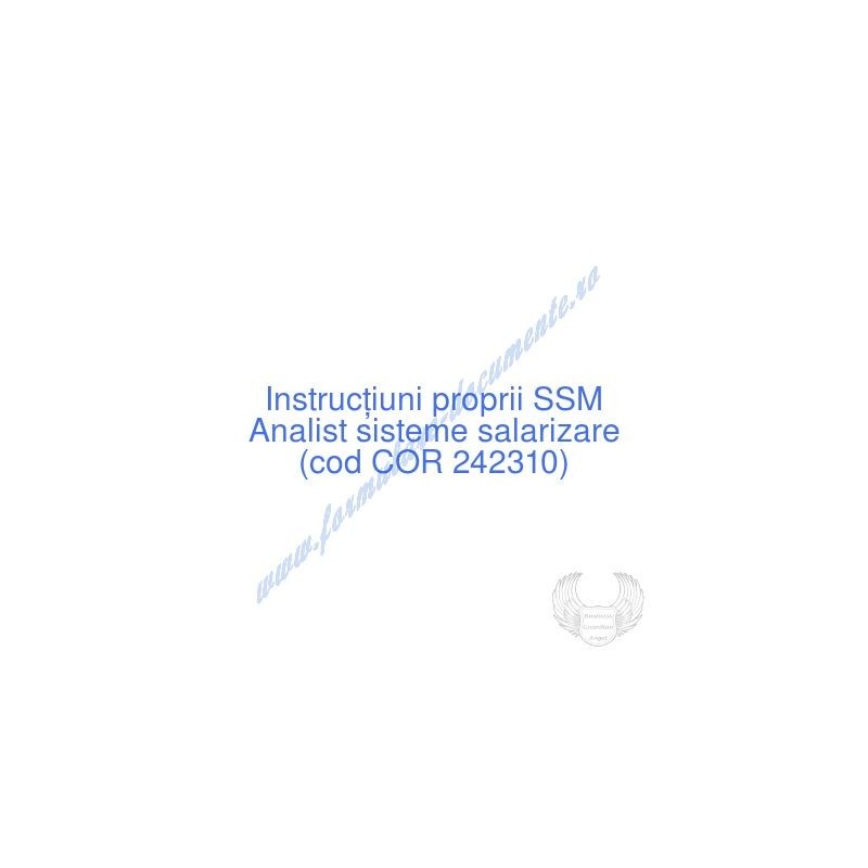 Aceste documente OBLIGATORII pentru ocupantul postului de Analist sisteme salarizare (cod COR 242310), sunt complet întocmite, respectând cerințele Codului muncii actualizat 2023, Legii securității și sănătății în muncă nr. 319/2006 (actualizată 2023), H.G. 1425/2006 (actualizată 2023) și răspund tuturor cerințelor standardelor de calitate referitoare la management (ISO 9001/ ISO 14001/ ISO 22000/ SR OHSAS 18001:2008/ ISO 45001:2018 etc.). Cuprinsul IPSSM pentru instruirea angajatului pe funcția de Analist sisteme salarizare :