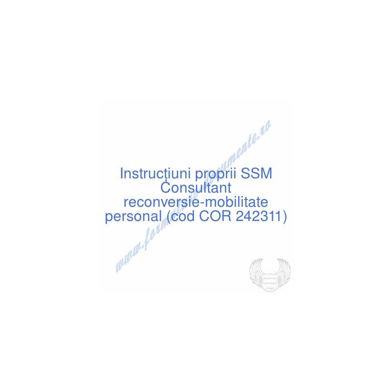 Aceste documente OBLIGATORII pentru ocupantul postului de Consultant reconversie-mobilitate personal (cod COR 242311), sunt complet întocmite, respectând cerințele Codului muncii actualizat 2023, Legii securității și sănătății în muncă nr. 319/2006 (actualizată 2023), H.G. 1425/2006 (actualizată 2023) și răspund tuturor cerințelor standardelor de calitate referitoare la management (ISO 9001/ ISO 14001/ ISO 22000/ SR OHSAS 18001:2008/ ISO 45001:2018 etc.). Cuprinsul IPSSM pentru instruirea angajatului pe funcția de Consultant reconversie-mobilitate personal :