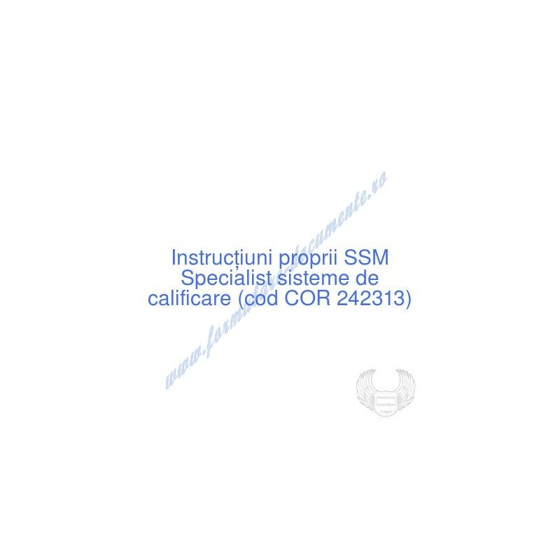 Aceste documente OBLIGATORII pentru ocupantul postului de Specialist sisteme de calificare (cod COR 242313), sunt complet întocmite, respectând cerințele Codului muncii actualizat 2023, Legii securității și sănătății în muncă nr. 319/2006 (actualizată 2023), H.G. 1425/2006 (actualizată 2023) și răspund tuturor cerințelor standardelor de calitate referitoare la management (ISO 9001/ ISO 14001/ ISO 22000/ SR OHSAS 18001:2008/ ISO 45001:2018 etc.). Cuprinsul IPSSM pentru instruirea angajatului pe funcția de Specialist sisteme de calificare :