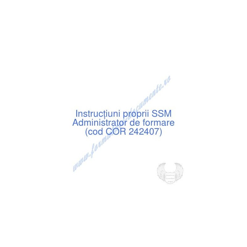 Aceste documente OBLIGATORII pentru ocupantul postului de Administrator de formare (cod COR 242407), sunt complet întocmite, respectând cerințele Codului muncii actualizat 2023, Legii securității și sănătății în muncă nr. 319/2006 (actualizată 2023), H.G. 1425/2006 (actualizată 2023) și răspund tuturor cerințelor standardelor de calitate referitoare la management (ISO 9001/ ISO 14001/ ISO 22000/ SR OHSAS 18001:2008/ ISO 45001:2018 etc.). Cuprinsul IPSSM pentru instruirea angajatului pe funcția de Administrator de formare :