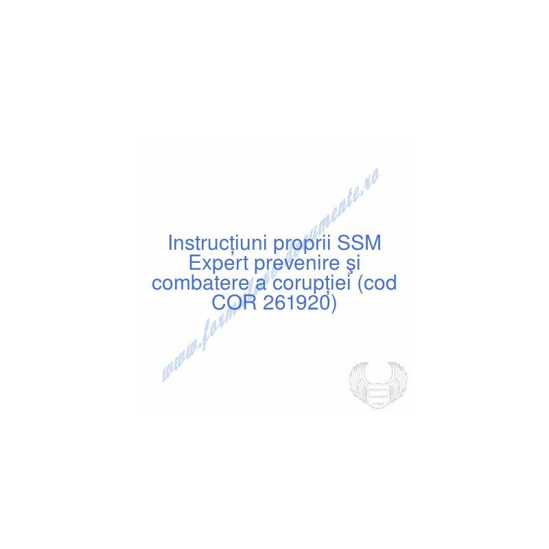 Aceste documente OBLIGATORII pentru ocupantul postului de Expert prevenire şi combatere a corupţiei (cod COR 261920), sunt complet întocmite, respectând cerințele Codului muncii actualizat 2023, Legii securității și sănătății în muncă nr. 319/2006 (actualizată 2023), H.G. 1425/2006 (actualizată 2023) și răspund tuturor cerințelor standardelor de calitate referitoare la management (ISO 9001/ ISO 14001/ ISO 22000/ SR OHSAS 18001:2008/ ISO 45001:2018 etc.). Cuprinsul IPSSM pentru instruirea angajatului pe funcția de Expert prevenire şi combatere a corupţiei :