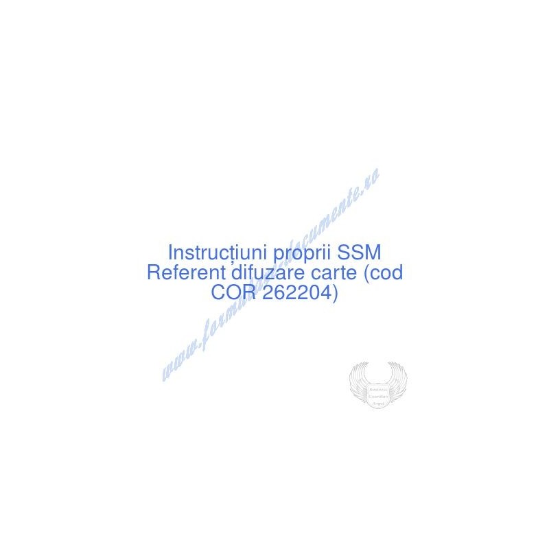 Aceste documente OBLIGATORII pentru ocupantul postului de Referent difuzare carte (cod COR 262204), sunt complet întocmite, respectând cerințele Codului muncii actualizat 2023, Legii securității și sănătății în muncă nr. 319/2006 (actualizată 2023), H.G. 1425/2006 (actualizată 2023) și răspund tuturor cerințelor standardelor de calitate referitoare la management (ISO 9001/ ISO 14001/ ISO 22000/ SR OHSAS 18001:2008/ ISO 45001:2018 etc.). Cuprinsul IPSSM pentru instruirea angajatului pe funcția de Referent difuzare carte :