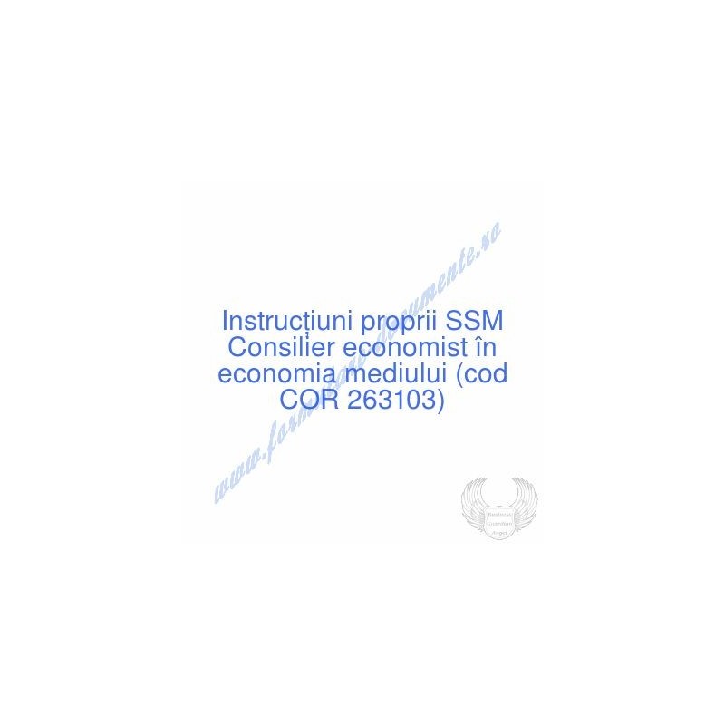 Aceste documente OBLIGATORII pentru ocupantul postului de Consilier economist în economia mediului (cod COR 263103), sunt complet întocmite, respectând cerințele Codului muncii actualizat 2023, Legii securității și sănătății în muncă nr. 319/2006 (actualizată 2023), H.G. 1425/2006 (actualizată 2023) și răspund tuturor cerințelor standardelor de calitate referitoare la management (ISO 9001/ ISO 14001/ ISO 22000/ SR OHSAS 18001:2008/ ISO 45001:2018 etc.). Cuprinsul IPSSM pentru instruirea angajatului pe funcția de Consilier economist în economia mediului :