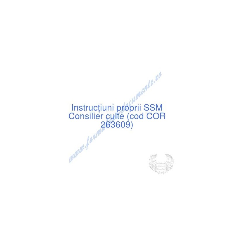 Aceste documente OBLIGATORII pentru ocupantul postului de Consilier culte (cod COR 263609), sunt complet întocmite, respectând cerințele Codului muncii actualizat 2023, Legii securității și sănătății în muncă nr. 319/2006 (actualizată 2023), H.G. 1425/2006 (actualizată 2023) și răspund tuturor cerințelor standardelor de calitate referitoare la management (ISO 9001/ ISO 14001/ ISO 22000/ SR OHSAS 18001:2008/ ISO 45001:2018 etc.). Cuprinsul IPSSM pentru instruirea angajatului pe funcția de Consilier culte :