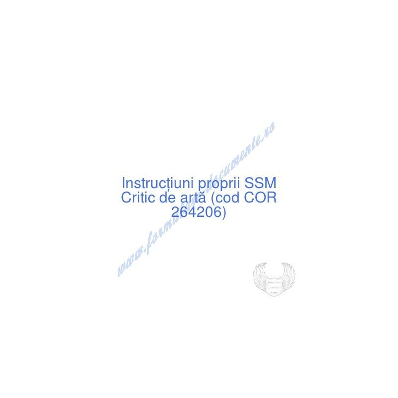 Aceste documente OBLIGATORII pentru ocupantul postului de Critic de artă (cod COR 264206), sunt complet întocmite, respectând cerințele Codului muncii actualizat 2023, Legii securității și sănătății în muncă nr. 319/2006 (actualizată 2023), H.G. 1425/2006 (actualizată 2023) și răspund tuturor cerințelor standardelor de calitate referitoare la management (ISO 9001/ ISO 14001/ ISO 22000/ SR OHSAS 18001:2008/ ISO 45001:2018 etc.). Cuprinsul IPSSM pentru instruirea angajatului pe funcția de Critic de artă :