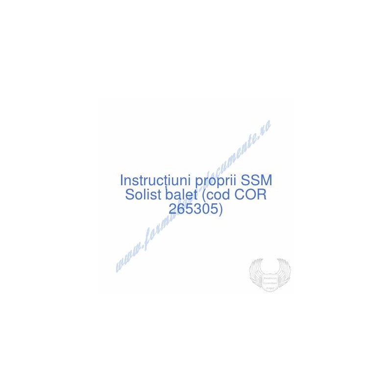 Aceste documente OBLIGATORII pentru ocupantul postului de Solist balet (cod COR 265305), sunt complet întocmite, respectând cerințele Codului muncii actualizat 2023, Legii securității și sănătății în muncă nr. 319/2006 (actualizată 2023), H.G. 1425/2006 (actualizată 2023) și răspund tuturor cerințelor standardelor de calitate referitoare la management (ISO 9001/ ISO 14001/ ISO 22000/ SR OHSAS 18001:2008/ ISO 45001:2018 etc.). Cuprinsul IPSSM pentru instruirea angajatului pe funcția de Solist balet :