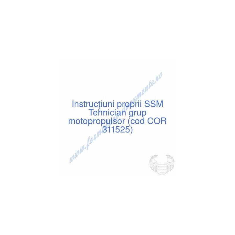 Aceste documente OBLIGATORII pentru ocupantul postului de Tehnician grup motopropulsor (cod COR 311525), sunt complet întocmite, respectând cerințele Codului muncii actualizat 2023, Legii securității și sănătății în muncă nr. 319/2006 (actualizată 2023), H.G. 1425/2006 (actualizată 2023) și răspund tuturor cerințelor standardelor de calitate referitoare la management (ISO 9001/ ISO 14001/ ISO 22000/ SR OHSAS 18001:2008/ ISO 45001:2018 etc.). Cuprinsul IPSSM pentru instruirea angajatului pe funcția de Tehnician grup motopropulsor :