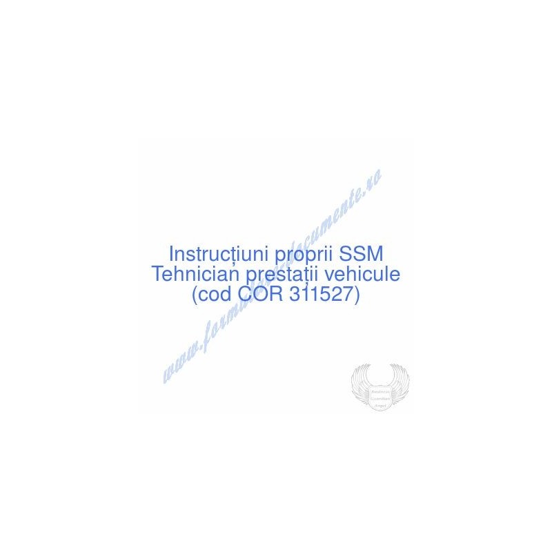 Aceste documente OBLIGATORII pentru ocupantul postului de Tehnician prestaţii vehicule (cod COR 311527), sunt complet întocmite, respectând cerințele Codului muncii actualizat 2023, Legii securității și sănătății în muncă nr. 319/2006 (actualizată 2023), H.G. 1425/2006 (actualizată 2023) și răspund tuturor cerințelor standardelor de calitate referitoare la management (ISO 9001/ ISO 14001/ ISO 22000/ SR OHSAS 18001:2008/ ISO 45001:2018 etc.). Cuprinsul IPSSM pentru instruirea angajatului pe funcția de Tehnician prestaţii vehicule :