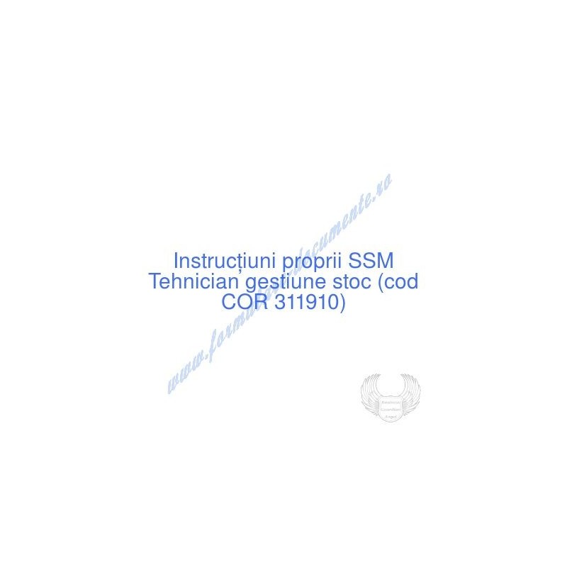 Aceste documente OBLIGATORII pentru ocupantul postului de Tehnician gestiune stoc (cod COR 311910), sunt complet întocmite, respectând cerințele Codului muncii actualizat 2023, Legii securității și sănătății în muncă nr. 319/2006 (actualizată 2023), H.G. 1425/2006 (actualizată 2023) și răspund tuturor cerințelor standardelor de calitate referitoare la management (ISO 9001/ ISO 14001/ ISO 22000/ SR OHSAS 18001:2008/ ISO 45001:2018 etc.). Cuprinsul IPSSM pentru instruirea angajatului pe funcția de Tehnician gestiune stoc :