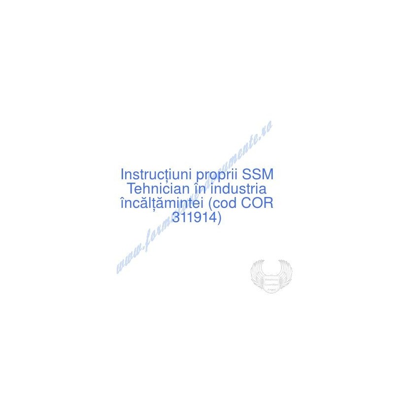 Aceste documente OBLIGATORII pentru ocupantul postului de Tehnician în industria încălţămintei (cod COR 311914), sunt complet întocmite, respectând cerințele Codului muncii actualizat 2023, Legii securității și sănătății în muncă nr. 319/2006 (actualizată 2023), H.G. 1425/2006 (actualizată 2023) și răspund tuturor cerințelor standardelor de calitate referitoare la management (ISO 9001/ ISO 14001/ ISO 22000/ SR OHSAS 18001:2008/ ISO 45001:2018 etc.). Cuprinsul IPSSM pentru instruirea angajatului pe funcția de Tehnician în industria încălţămintei :