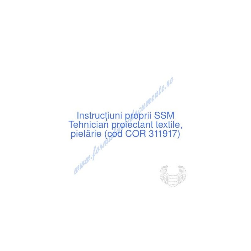 Aceste documente OBLIGATORII pentru ocupantul postului de Tehnician proiectant textile, pielărie (cod COR 311917), sunt complet întocmite, respectând cerințele Codului muncii actualizat 2023, Legii securității și sănătății în muncă nr. 319/2006 (actualizată 2023), H.G. 1425/2006 (actualizată 2023) și răspund tuturor cerințelor standardelor de calitate referitoare la management (ISO 9001/ ISO 14001/ ISO 22000/ SR OHSAS 18001:2008/ ISO 45001:2018 etc.). Cuprinsul IPSSM pentru instruirea angajatului pe funcția de Tehnician proiectant textile, pielărie :