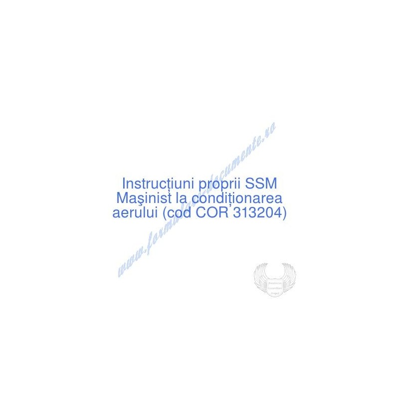 Aceste documente OBLIGATORII pentru ocupantul postului de Maşinist la condiţionarea aerului (cod COR 313204), sunt complet întocmite, respectând cerințele Codului muncii actualizat 2023, Legii securității și sănătății în muncă nr. 319/2006 (actualizată 2023), H.G. 1425/2006 (actualizată 2023) și răspund tuturor cerințelor standardelor de calitate referitoare la management (ISO 9001/ ISO 14001/ ISO 22000/ SR OHSAS 18001:2008/ ISO 45001:2018 etc.). Cuprinsul IPSSM pentru instruirea angajatului pe funcția de Maşinist la condiţionarea aerului :