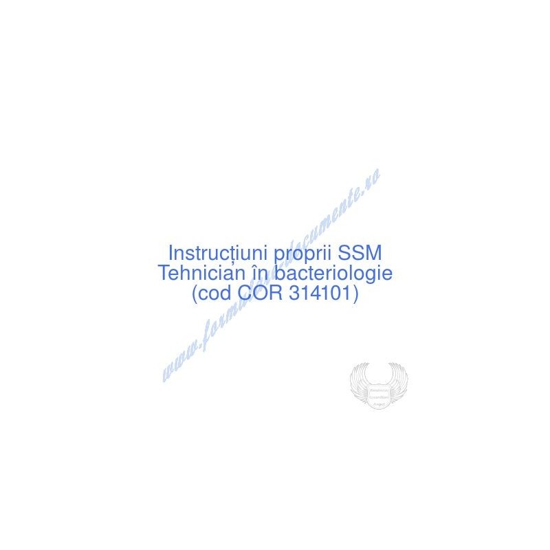 Aceste documente OBLIGATORII pentru ocupantul postului de Tehnician în bacteriologie (cod COR 314101), sunt complet întocmite, respectând cerințele Codului muncii actualizat 2023, Legii securității și sănătății în muncă nr. 319/2006 (actualizată 2023), H.G. 1425/2006 (actualizată 2023) și răspund tuturor cerințelor standardelor de calitate referitoare la management (ISO 9001/ ISO 14001/ ISO 22000/ SR OHSAS 18001:2008/ ISO 45001:2018 etc.). Cuprinsul IPSSM pentru instruirea angajatului pe funcția de Tehnician în bacteriologie :
