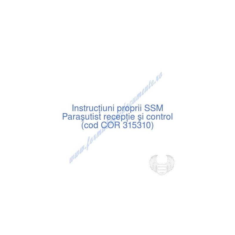 Aceste documente OBLIGATORII pentru ocupantul postului de Paraşutist recepţie şi control (cod COR 315310), sunt complet întocmite, respectând cerințele Codului muncii actualizat 2023, Legii securității și sănătății în muncă nr. 319/2006 (actualizată 2023), H.G. 1425/2006 (actualizată 2023) și răspund tuturor cerințelor standardelor de calitate referitoare la management (ISO 9001/ ISO 14001/ ISO 22000/ SR OHSAS 18001:2008/ ISO 45001:2018 etc.). Cuprinsul IPSSM pentru instruirea angajatului pe funcția de Paraşutist recepţie şi control :