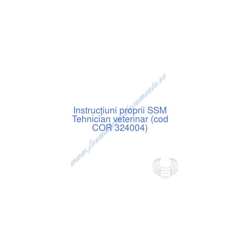 Aceste documente OBLIGATORII pentru ocupantul postului de Tehnician veterinar (cod COR 324004), sunt complet întocmite, respectând cerințele Codului muncii actualizat 2023, Legii securității și sănătății în muncă nr. 319/2006 (actualizată 2023), H.G. 1425/2006 (actualizată 2023) și răspund tuturor cerințelor standardelor de calitate referitoare la management (ISO 9001/ ISO 14001/ ISO 22000/ SR OHSAS 18001:2008/ ISO 45001:2018 etc.). Cuprinsul IPSSM pentru instruirea angajatului pe funcția de Tehnician veterinar :