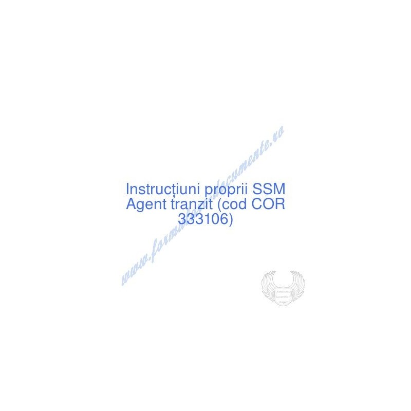 Aceste documente OBLIGATORII pentru ocupantul postului de Agent tranzit (cod COR 333106), sunt complet întocmite, respectând cerințele Codului muncii actualizat 2023, Legii securității și sănătății în muncă nr. 319/2006 (actualizată 2023), H.G. 1425/2006 (actualizată 2023) și răspund tuturor cerințelor standardelor de calitate referitoare la management (ISO 9001/ ISO 14001/ ISO 22000/ SR OHSAS 18001:2008/ ISO 45001:2018 etc.). Cuprinsul IPSSM pentru instruirea angajatului pe funcția de Agent tranzit :