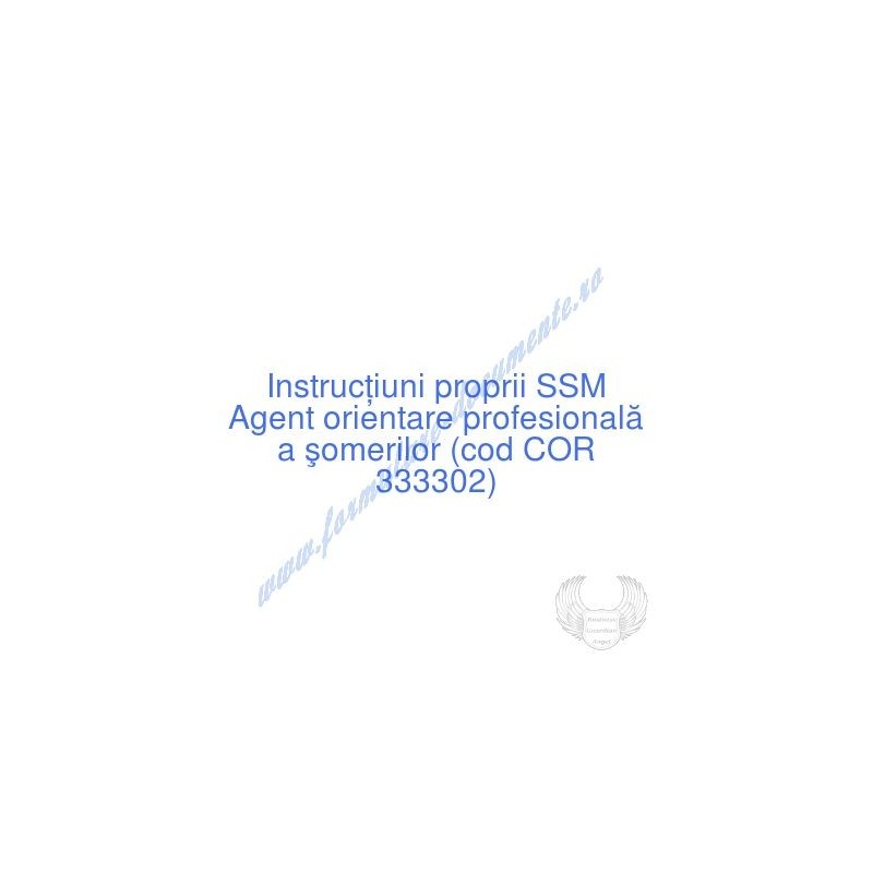 Aceste documente OBLIGATORII pentru ocupantul postului de Agent orientare profesională a şomerilor (cod COR 333302), sunt complet întocmite, respectând cerințele Codului muncii actualizat 2023, Legii securității și sănătății în muncă nr. 319/2006 (actualizată 2023), H.G. 1425/2006 (actualizată 2023) și răspund tuturor cerințelor standardelor de calitate referitoare la management (ISO 9001/ ISO 14001/ ISO 22000/ SR OHSAS 18001:2008/ ISO 45001:2018 etc.). Cuprinsul IPSSM pentru instruirea angajatului pe funcția de Agent orientare profesională a şomerilor :
