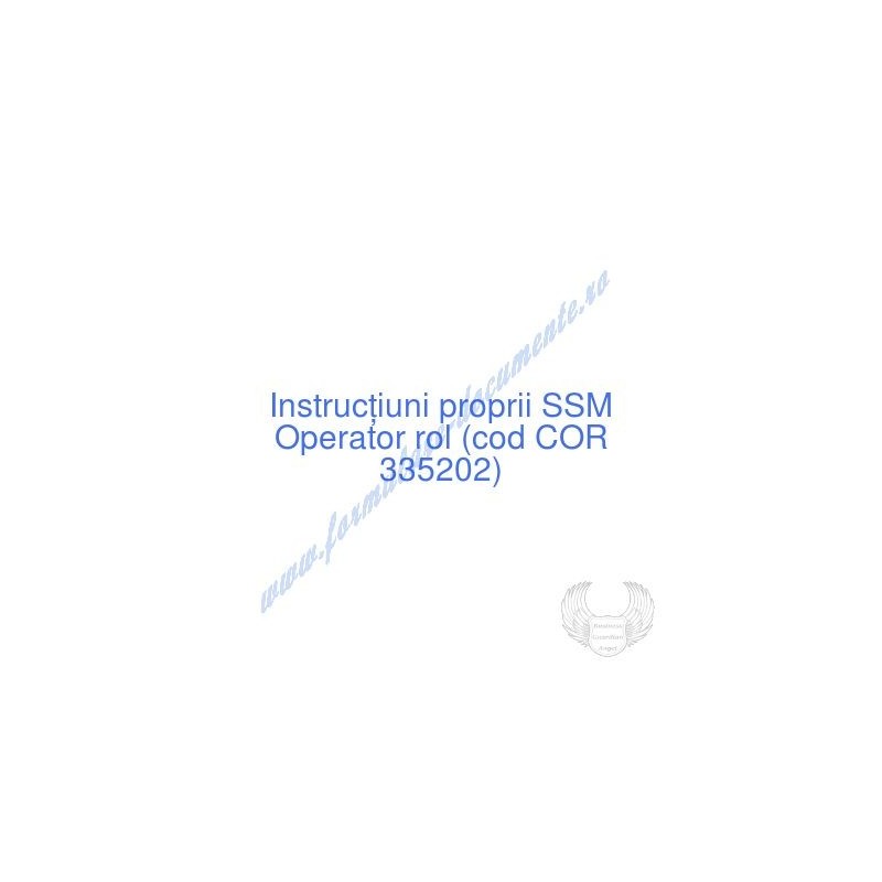 Aceste documente OBLIGATORII pentru ocupantul postului de Operator rol (cod COR 335202), sunt complet întocmite, respectând cerințele Codului muncii actualizat 2023, Legii securității și sănătății în muncă nr. 319/2006 (actualizată 2023), H.G. 1425/2006 (actualizată 2023) și răspund tuturor cerințelor standardelor de calitate referitoare la management (ISO 9001/ ISO 14001/ ISO 22000/ SR OHSAS 18001:2008/ ISO 45001:2018 etc.). Cuprinsul IPSSM pentru instruirea angajatului pe funcția de Operator rol :