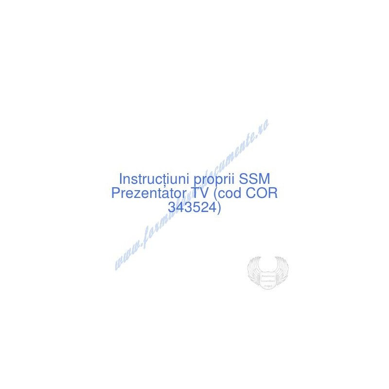 Aceste documente OBLIGATORII pentru ocupantul postului de Prezentator TV (cod COR 343524), sunt complet întocmite, respectând cerințele Codului muncii actualizat 2023, Legii securității și sănătății în muncă nr. 319/2006 (actualizată 2023), H.G. 1425/2006 (actualizată 2023) și răspund tuturor cerințelor standardelor de calitate referitoare la management (ISO 9001/ ISO 14001/ ISO 22000/ SR OHSAS 18001:2008/ ISO 45001:2018 etc.). Cuprinsul IPSSM pentru instruirea angajatului pe funcția de Prezentator TV :