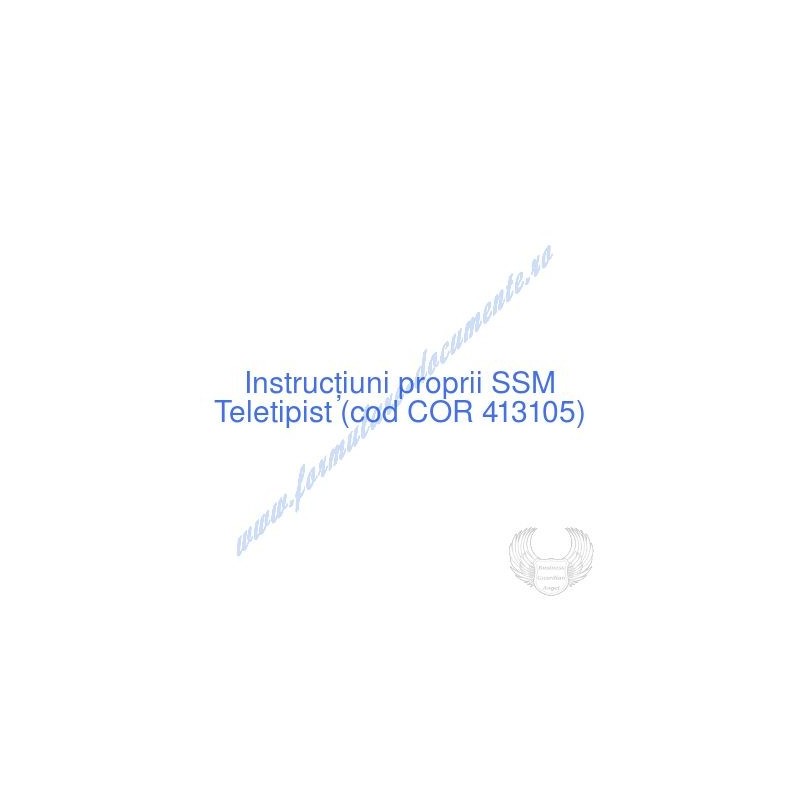 Aceste documente OBLIGATORII pentru ocupantul postului de Teletipist (cod COR 413105), sunt complet întocmite, respectând cerințele Codului muncii actualizat 2023, Legii securității și sănătății în muncă nr. 319/2006 (actualizată 2023), H.G. 1425/2006 (actualizată 2023) și răspund tuturor cerințelor standardelor de calitate referitoare la management (ISO 9001/ ISO 14001/ ISO 22000/ SR OHSAS 18001:2008/ ISO 45001:2018 etc.). Cuprinsul IPSSM pentru instruirea angajatului pe funcția de Teletipist :