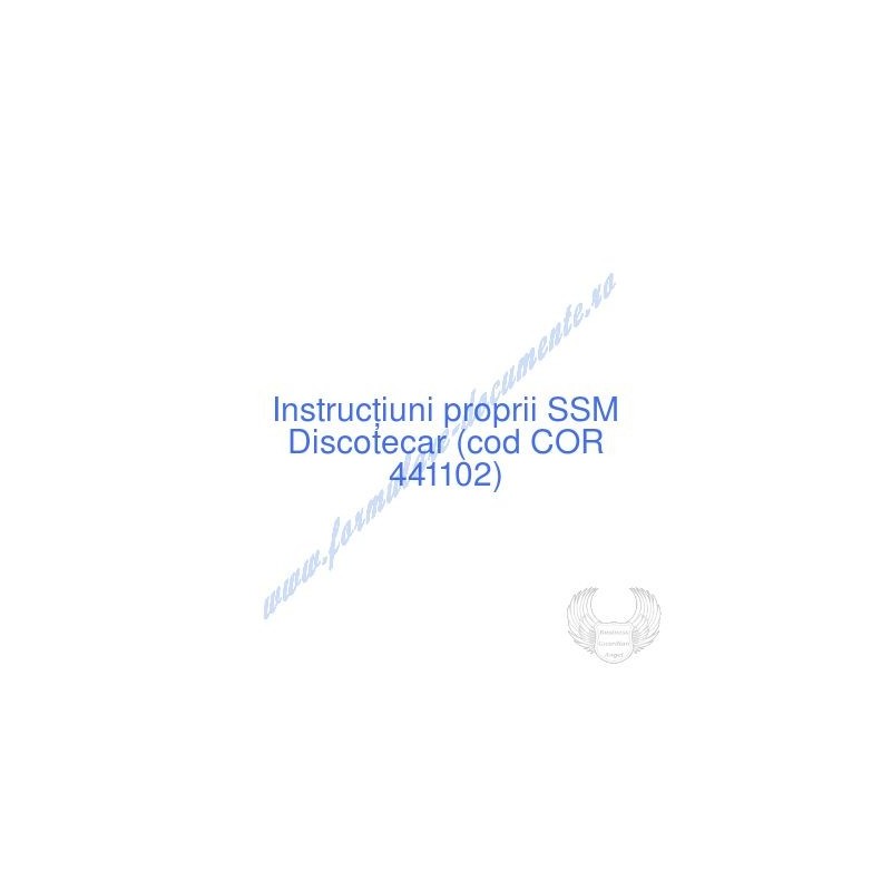 Aceste documente OBLIGATORII pentru ocupantul postului de Discotecar (cod COR 441102), sunt complet întocmite, respectând cerințele Codului muncii actualizat 2023, Legii securității și sănătății în muncă nr. 319/2006 (actualizată 2023), H.G. 1425/2006 (actualizată 2023) și răspund tuturor cerințelor standardelor de calitate referitoare la management (ISO 9001/ ISO 14001/ ISO 22000/ SR OHSAS 18001:2008/ ISO 45001:2018 etc.). Cuprinsul IPSSM pentru instruirea angajatului pe funcția de Discotecar :
