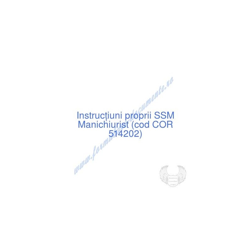 Aceste documente OBLIGATORII pentru ocupantul postului de Manichiurist (cod COR 514202), sunt complet întocmite, respectând cerințele Codului muncii actualizat 2023, Legii securității și sănătății în muncă nr. 319/2006 (actualizată 2023), H.G. 1425/2006 (actualizată 2023) și răspund tuturor cerințelor standardelor de calitate referitoare la management (ISO 9001/ ISO 14001/ ISO 22000/ SR OHSAS 18001:2008/ ISO 45001:2018 etc.). Cuprinsul IPSSM pentru instruirea angajatului pe funcția de Manichiurist :