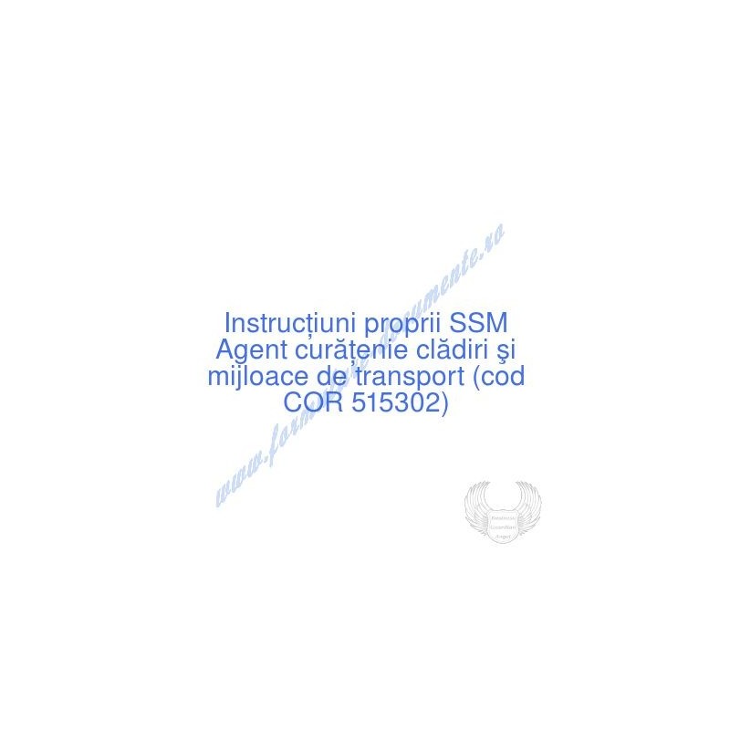 Aceste documente OBLIGATORII pentru ocupantul postului de Agent curăţenie clădiri şi mijloace de transport (cod COR 515302), sunt complet întocmite, respectând cerințele Codului muncii actualizat 2023, Legii securității și sănătății în muncă nr. 319/2006 (actualizată 2023), H.G. 1425/2006 (actualizată 2023) și răspund tuturor cerințelor standardelor de calitate referitoare la management (ISO 9001/ ISO 14001/ ISO 22000/ SR OHSAS 18001:2008/ ISO 45001:2018 etc.). Cuprinsul IPSSM pentru instruirea angajatului pe funcția de Agent curăţenie clădiri şi mijloace de transport :
