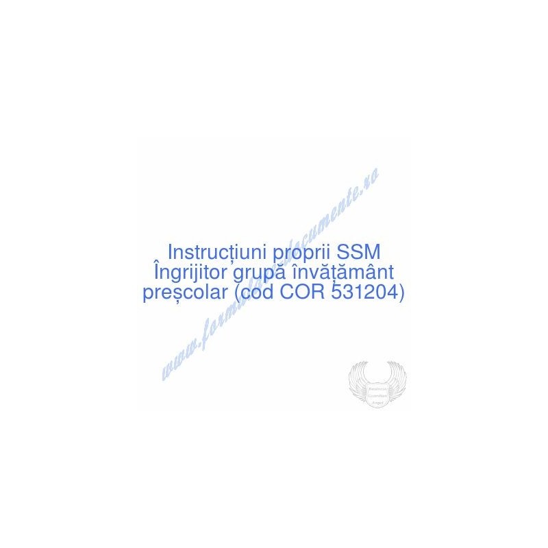 Aceste documente OBLIGATORII pentru ocupantul postului de Îngrijitor grupă învățământ preșcolar (cod COR 531204), sunt complet întocmite, respectând cerințele Codului muncii actualizat 2023, Legii securității și sănătății în muncă nr. 319/2006 (actualizată 2023), H.G. 1425/2006 (actualizată 2023) și răspund tuturor cerințelor standardelor de calitate referitoare la management (ISO 9001/ ISO 14001/ ISO 22000/ SR OHSAS 18001:2008/ ISO 45001:2018 etc.). Cuprinsul IPSSM pentru instruirea angajatului pe funcția de Îngrijitor grupă învățământ preșcolar :