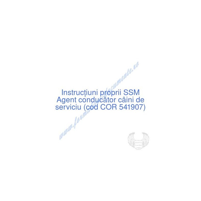 Aceste documente OBLIGATORII pentru ocupantul postului de Agent conducător câini de serviciu (cod COR 541907), sunt complet întocmite, respectând cerințele Codului muncii actualizat 2023, Legii securității și sănătății în muncă nr. 319/2006 (actualizată 2023), H.G. 1425/2006 (actualizată 2023) și răspund tuturor cerințelor standardelor de calitate referitoare la management (ISO 9001/ ISO 14001/ ISO 22000/ SR OHSAS 18001:2008/ ISO 45001:2018 etc.). Cuprinsul IPSSM pentru instruirea angajatului pe funcția de Agent conducător câini de serviciu :