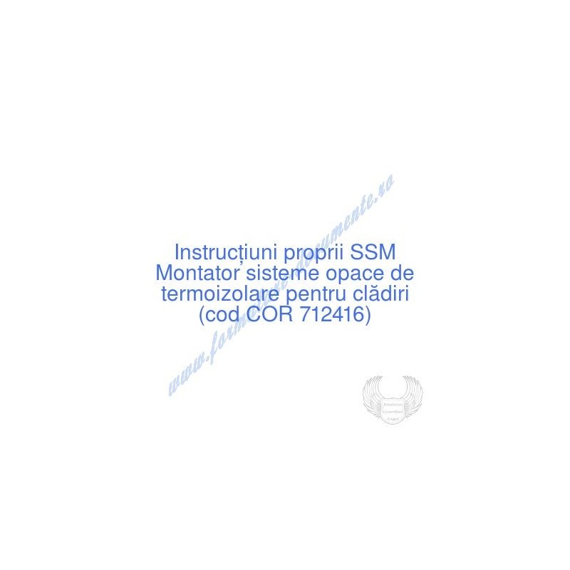 Aceste documente OBLIGATORII pentru ocupantul postului de Montator sisteme opace de termoizolare pentru clădiri (cod COR 712416), sunt complet întocmite, respectând cerințele Codului muncii actualizat 2023, Legii securității și sănătății în muncă nr. 319/2006 (actualizată 2023), H.G. 1425/2006 (actualizată 2023) și răspund tuturor cerințelor standardelor de calitate referitoare la management (ISO 9001/ ISO 14001/ ISO 22000/ SR OHSAS 18001:2008/ ISO 45001:2018 etc.). Cuprinsul IPSSM pentru instruirea angajatului pe funcția de Montator sisteme opace de termoizolare pentru clădiri :