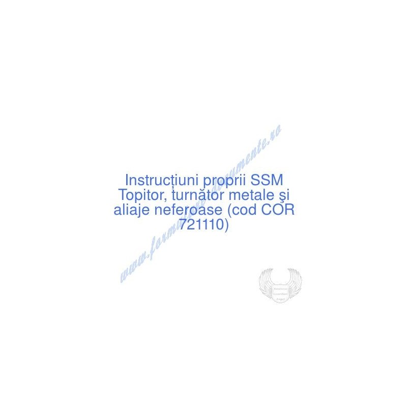 Aceste documente OBLIGATORII pentru ocupantul postului de Topitor, turnător metale şi aliaje neferoase (cod COR 721110), sunt complet întocmite, respectând cerințele Codului muncii actualizat 2023, Legii securității și sănătății în muncă nr. 319/2006 (actualizată 2023), H.G. 1425/2006 (actualizată 2023) și răspund tuturor cerințelor standardelor de calitate referitoare la management (ISO 9001/ ISO 14001/ ISO 22000/ SR OHSAS 18001:2008/ ISO 45001:2018 etc.). Cuprinsul IPSSM pentru instruirea angajatului pe funcția de Topitor, turnător metale şi aliaje neferoase :