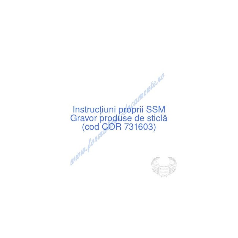 Aceste documente OBLIGATORII pentru ocupantul postului de Gravor produse de sticlă (cod COR 731603), sunt complet întocmite, respectând cerințele Codului muncii actualizat 2023, Legii securității și sănătății în muncă nr. 319/2006 (actualizată 2023), H.G. 1425/2006 (actualizată 2023) și răspund tuturor cerințelor standardelor de calitate referitoare la management (ISO 9001/ ISO 14001/ ISO 22000/ SR OHSAS 18001:2008/ ISO 45001:2018 etc.). Cuprinsul IPSSM pentru instruirea angajatului pe funcția de Gravor produse de sticlă :