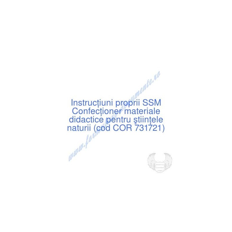 Aceste documente OBLIGATORII pentru ocupantul postului de Confecţioner materiale didactice pentru ştiinţele naturii (cod COR 731721), sunt complet întocmite, respectând cerințele Codului muncii actualizat 2023, Legii securității și sănătății în muncă nr. 319/2006 (actualizată 2023), H.G. 1425/2006 (actualizată 2023) și răspund tuturor cerințelor standardelor de calitate referitoare la management (ISO 9001/ ISO 14001/ ISO 22000/ SR OHSAS 18001:2008/ ISO 45001:2018 etc.). Cuprinsul IPSSM pentru instruirea angajatului pe funcția de Confecţioner materiale didactice pentru ştiinţele naturii :