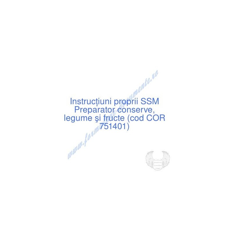 Aceste documente OBLIGATORII pentru ocupantul postului de Preparator conserve, legume şi fructe (cod COR 751401), sunt complet întocmite, respectând cerințele Codului muncii actualizat 2023, Legii securității și sănătății în muncă nr. 319/2006 (actualizată 2023), H.G. 1425/2006 (actualizată 2023) și răspund tuturor cerințelor standardelor de calitate referitoare la management (ISO 9001/ ISO 14001/ ISO 22000/ SR OHSAS 18001:2008/ ISO 45001:2018 etc.). Cuprinsul IPSSM pentru instruirea angajatului pe funcția de Preparator conserve, legume şi fructe :