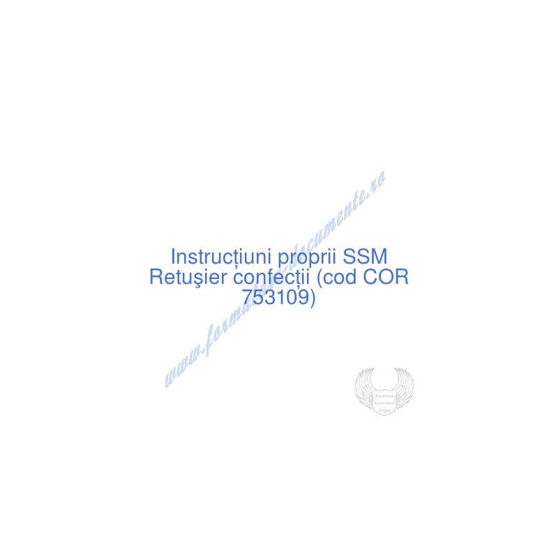 Aceste documente OBLIGATORII pentru ocupantul postului de Retuşier confecţii (cod COR 753109), sunt complet întocmite, respectând cerințele Codului muncii actualizat 2023, Legii securității și sănătății în muncă nr. 319/2006 (actualizată 2023), H.G. 1425/2006 (actualizată 2023) și răspund tuturor cerințelor standardelor de calitate referitoare la management (ISO 9001/ ISO 14001/ ISO 22000/ SR OHSAS 18001:2008/ ISO 45001:2018 etc.). Cuprinsul IPSSM pentru instruirea angajatului pe funcția de Retuşier confecţii :