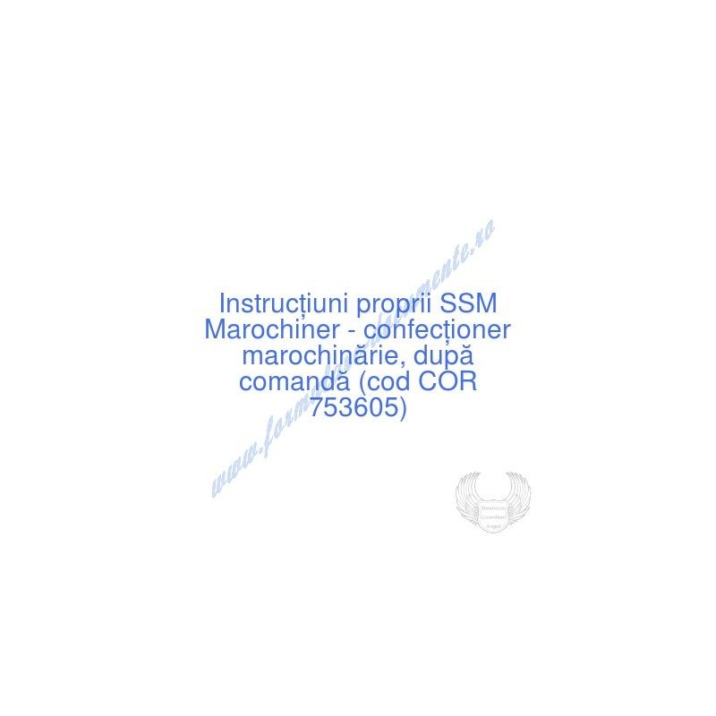 Aceste documente OBLIGATORII pentru ocupantul postului de Marochiner - confecţioner marochinărie, după comandă (cod COR 753605), sunt complet întocmite, respectând cerințele Codului muncii actualizat 2023, Legii securității și sănătății în muncă nr. 319/2006 (actualizată 2023), H.G. 1425/2006 (actualizată 2023) și răspund tuturor cerințelor standardelor de calitate referitoare la management (ISO 9001/ ISO 14001/ ISO 22000/ SR OHSAS 18001:2008/ ISO 45001:2018 etc.). Cuprinsul IPSSM pentru instruirea angajatului pe funcția de Marochiner - confecţioner marochinărie, după comandă :