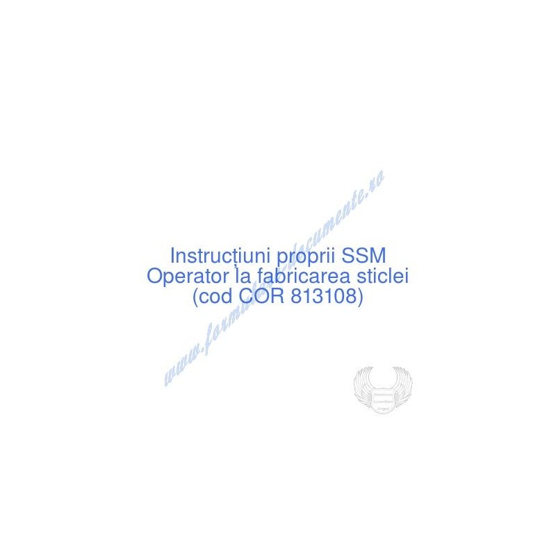 Aceste documente OBLIGATORII pentru ocupantul postului de Operator la fabricarea sticlei (cod COR 813108), sunt complet întocmite, respectând cerințele Codului muncii actualizat 2023, Legii securității și sănătății în muncă nr. 319/2006 (actualizată 2023), H.G. 1425/2006 (actualizată 2023) și răspund tuturor cerințelor standardelor de calitate referitoare la management (ISO 9001/ ISO 14001/ ISO 22000/ SR OHSAS 18001:2008/ ISO 45001:2018 etc.). Cuprinsul IPSSM pentru instruirea angajatului pe funcția de Operator la fabricarea sticlei :