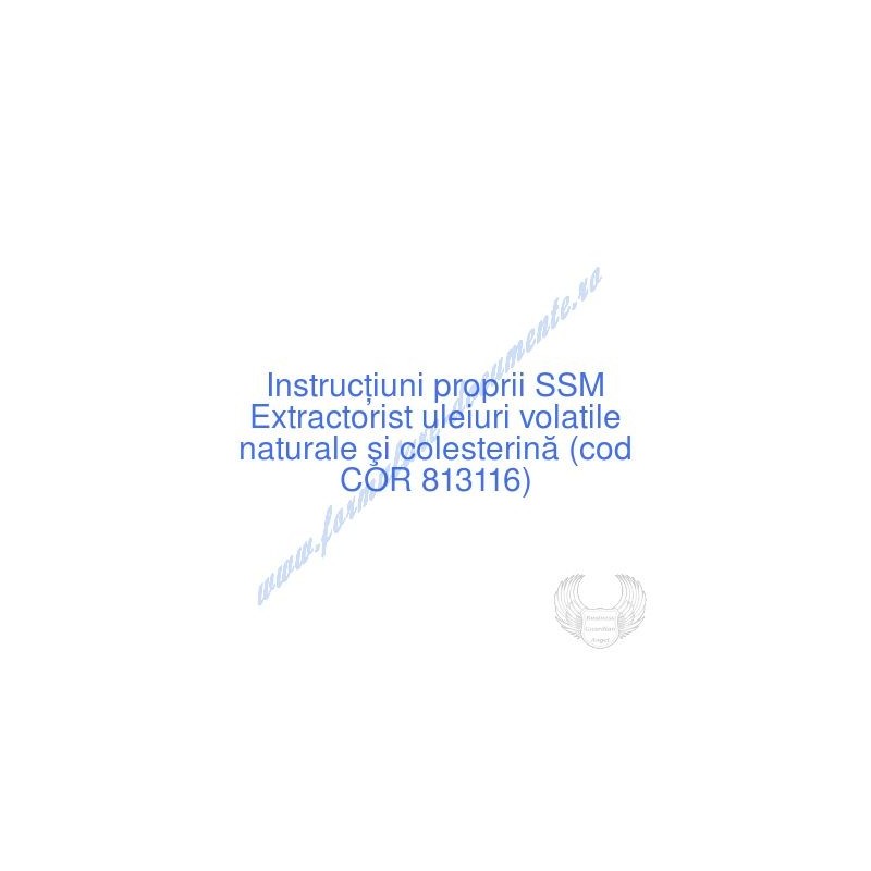 Aceste documente OBLIGATORII pentru ocupantul postului de Extractorist uleiuri volatile naturale şi colesterină (cod COR 813116), sunt complet întocmite, respectând cerințele Codului muncii actualizat 2023, Legii securității și sănătății în muncă nr. 319/2006 (actualizată 2023), H.G. 1425/2006 (actualizată 2023) și răspund tuturor cerințelor standardelor de calitate referitoare la management (ISO 9001/ ISO 14001/ ISO 22000/ SR OHSAS 18001:2008/ ISO 45001:2018 etc.). Cuprinsul IPSSM pentru instruirea angajatului pe funcția de Extractorist uleiuri volatile naturale şi colesterină :