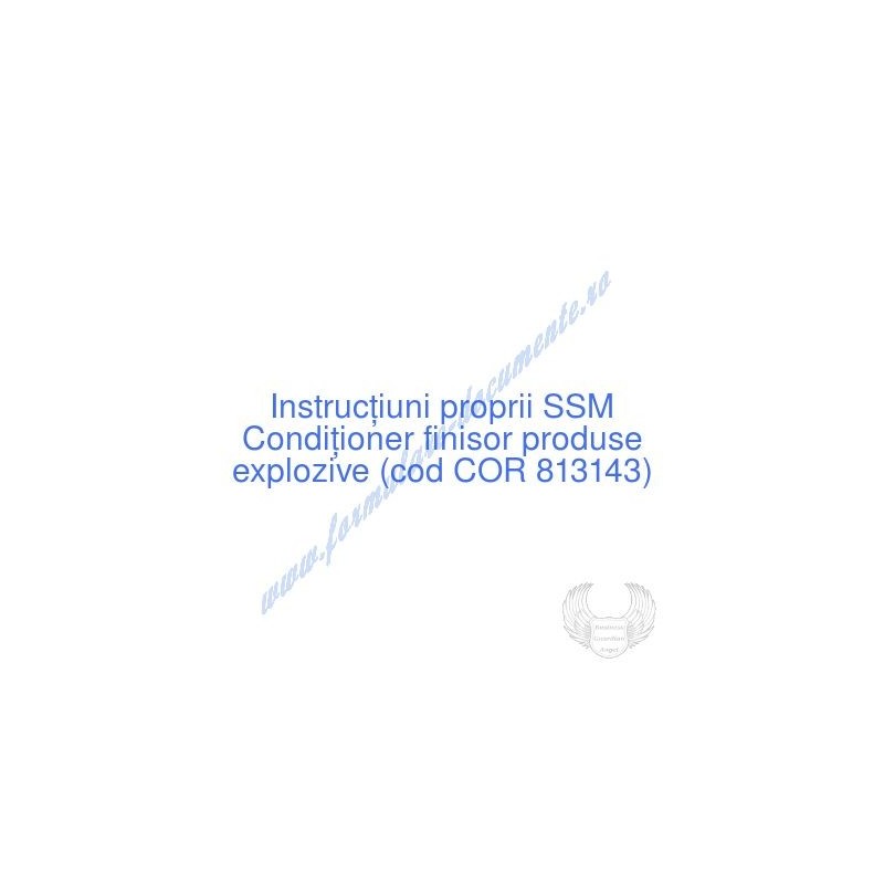 Aceste documente OBLIGATORII pentru ocupantul postului de Condiţioner finisor produse explozive (cod COR 813143), sunt complet întocmite, respectând cerințele Codului muncii actualizat 2023, Legii securității și sănătății în muncă nr. 319/2006 (actualizată 2023), H.G. 1425/2006 (actualizată 2023) și răspund tuturor cerințelor standardelor de calitate referitoare la management (ISO 9001/ ISO 14001/ ISO 22000/ SR OHSAS 18001:2008/ ISO 45001:2018 etc.). Cuprinsul IPSSM pentru instruirea angajatului pe funcția de Condiţioner finisor produse explozive :