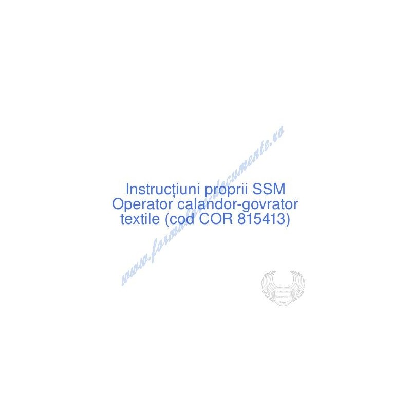 Aceste documente OBLIGATORII pentru ocupantul postului de Operator calandor-govrator textile (cod COR 815413), sunt complet întocmite, respectând cerințele Codului muncii actualizat 2023, Legii securității și sănătății în muncă nr. 319/2006 (actualizată 2023), H.G. 1425/2006 (actualizată 2023) și răspund tuturor cerințelor standardelor de calitate referitoare la management (ISO 9001/ ISO 14001/ ISO 22000/ SR OHSAS 18001:2008/ ISO 45001:2018 etc.). Cuprinsul IPSSM pentru instruirea angajatului pe funcția de Operator calandor-govrator textile :