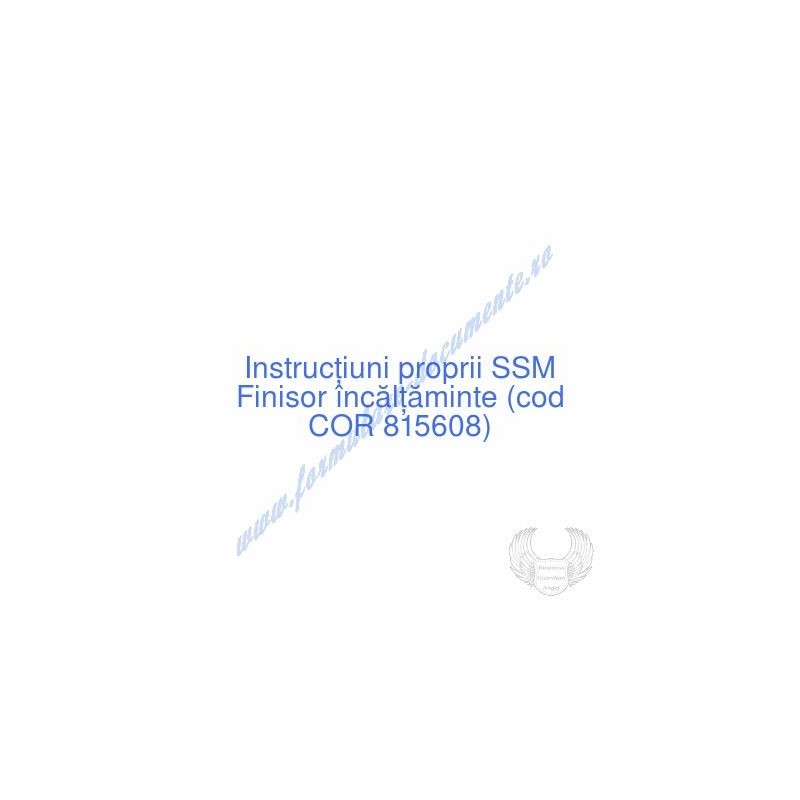 Aceste documente OBLIGATORII pentru ocupantul postului de Finisor încălţăminte (cod COR 815608), sunt complet întocmite, respectând cerințele Codului muncii actualizat 2023, Legii securității și sănătății în muncă nr. 319/2006 (actualizată 2023), H.G. 1425/2006 (actualizată 2023) și răspund tuturor cerințelor standardelor de calitate referitoare la management (ISO 9001/ ISO 14001/ ISO 22000/ SR OHSAS 18001:2008/ ISO 45001:2018 etc.). Cuprinsul IPSSM pentru instruirea angajatului pe funcția de Finisor încălţăminte :