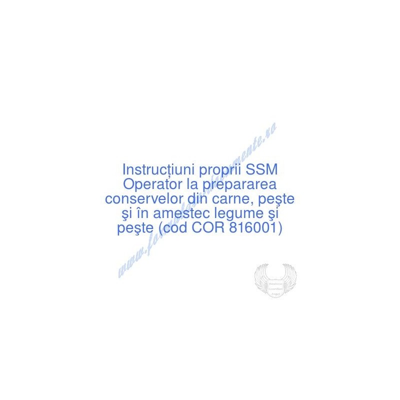 Aceste documente OBLIGATORII pentru ocupantul postului de Operator la prepararea conservelor din carne, peşte şi în amestec legume şi peşte (cod COR 816001), sunt complet întocmite, respectând cerințele Codului muncii actualizat 2023, Legii securității și sănătății în muncă nr. 319/2006 (actualizată 2023), H.G. 1425/2006 (actualizată 2023) și răspund tuturor cerințelor standardelor de calitate referitoare la management (ISO 9001/ ISO 14001/ ISO 22000/ SR OHSAS 18001:2008/ ISO 45001:2018 etc.). Cuprinsul IPSSM pentru instruirea angajatului pe funcția de Operator la prepararea conservelor din carne, peşte şi în amestec legume şi peşte :