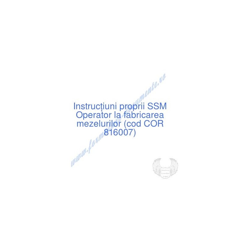Aceste documente OBLIGATORII pentru ocupantul postului de Operator la fabricarea mezelurilor (cod COR 816007), sunt complet întocmite, respectând cerințele Codului muncii actualizat 2023, Legii securității și sănătății în muncă nr. 319/2006 (actualizată 2023), H.G. 1425/2006 (actualizată 2023) și răspund tuturor cerințelor standardelor de calitate referitoare la management (ISO 9001/ ISO 14001/ ISO 22000/ SR OHSAS 18001:2008/ ISO 45001:2018 etc.). Cuprinsul IPSSM pentru instruirea angajatului pe funcția de Operator la fabricarea mezelurilor :