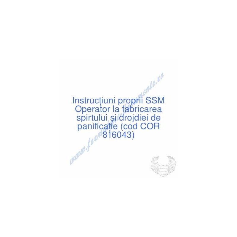 Aceste documente OBLIGATORII pentru ocupantul postului de Operator la fabricarea spirtului şi drojdiei de panificaţie (cod COR 816043), sunt complet întocmite, respectând cerințele Codului muncii actualizat 2023, Legii securității și sănătății în muncă nr. 319/2006 (actualizată 2023), H.G. 1425/2006 (actualizată 2023) și răspund tuturor cerințelor standardelor de calitate referitoare la management (ISO 9001/ ISO 14001/ ISO 22000/ SR OHSAS 18001:2008/ ISO 45001:2018 etc.). Cuprinsul IPSSM pentru instruirea angajatului pe funcția de Operator la fabricarea spirtului şi drojdiei de panificaţie :